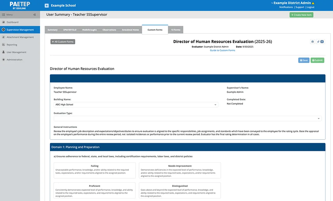 To meet this need, the district implemented PAETEP’s Custom Forms with Support Staff Module. Carlisle was able to design a custom evaluation rubric that reflects the strategic and operational functions of their HR leadership. Edulink’s software engineering team partnered with the district to understand their goals and custom-build a form that is now available to all PAETEP clients as a support staff evaluation template.